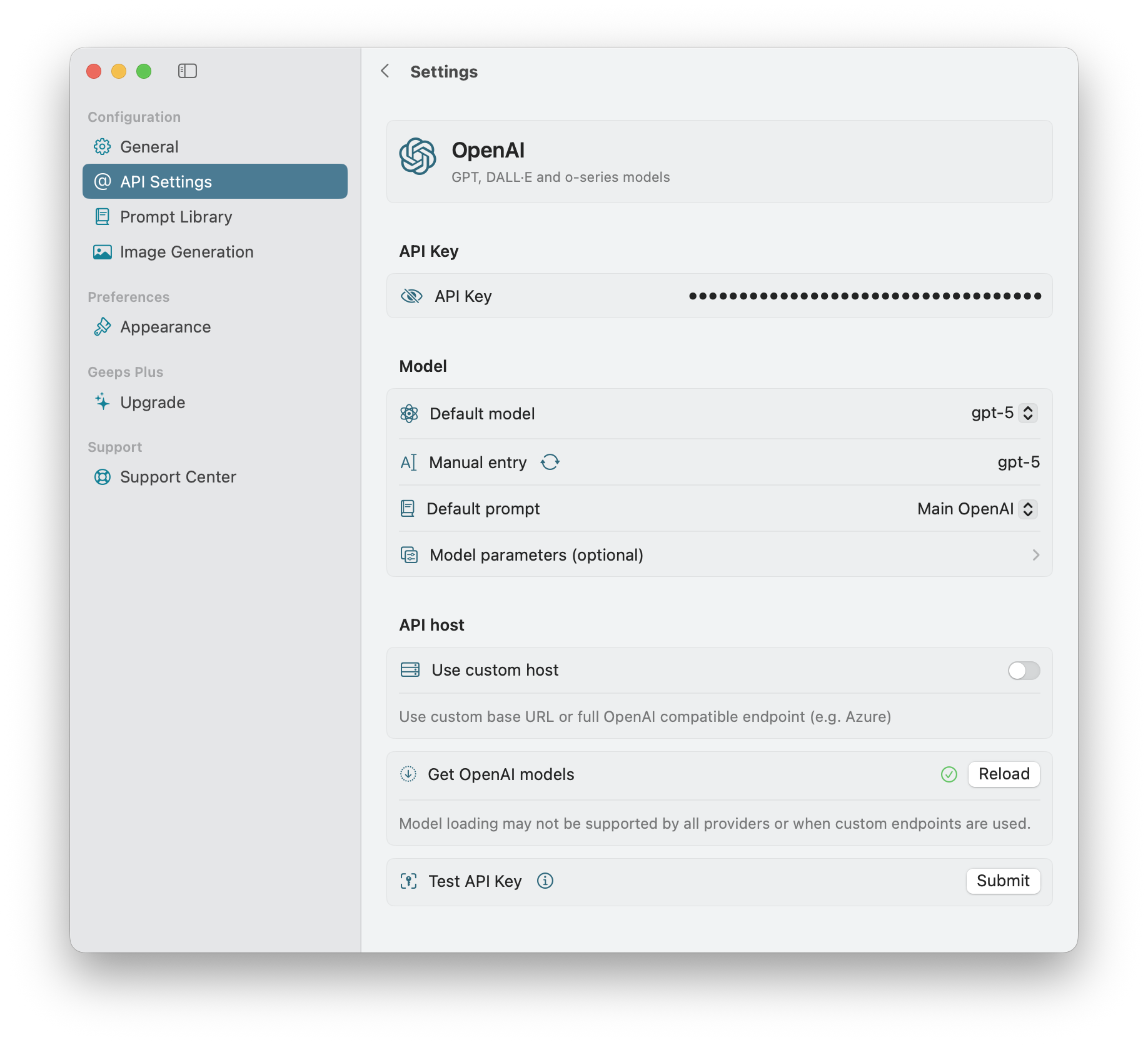 To start using Geeps you need an OpenAI API Key. Or multiple keys if you enabled multiple model providers.